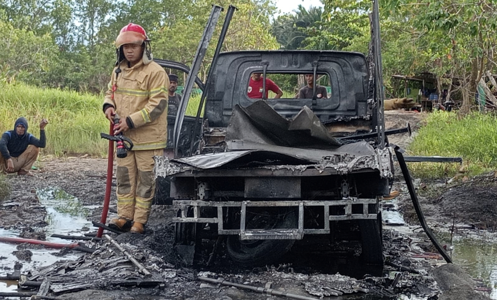 Saat api mulai membesar, pengemudi disebut langsung membelokkan kendaraan ke lokasi yang jauh dari permukiman warga, diduga untuk menghindari risiko kebakaran merembet ke rumah penduduk.