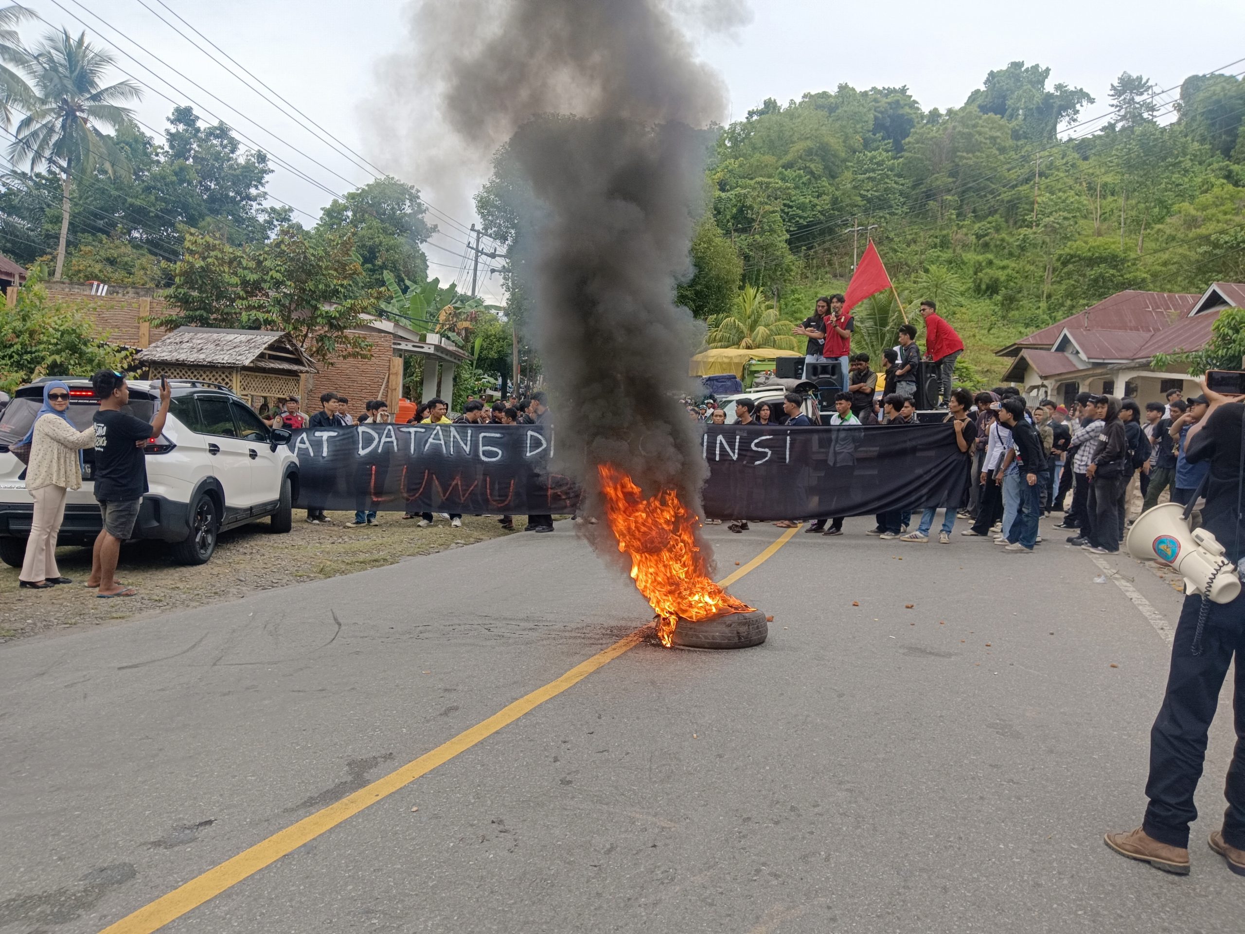 Selain menutup jalan, massa aksi membentangkan kain hitam bertuliskan “Selamat Datang di Provinsi Luwu Raya” serta membakar ban bekas sebagai bentuk protes.