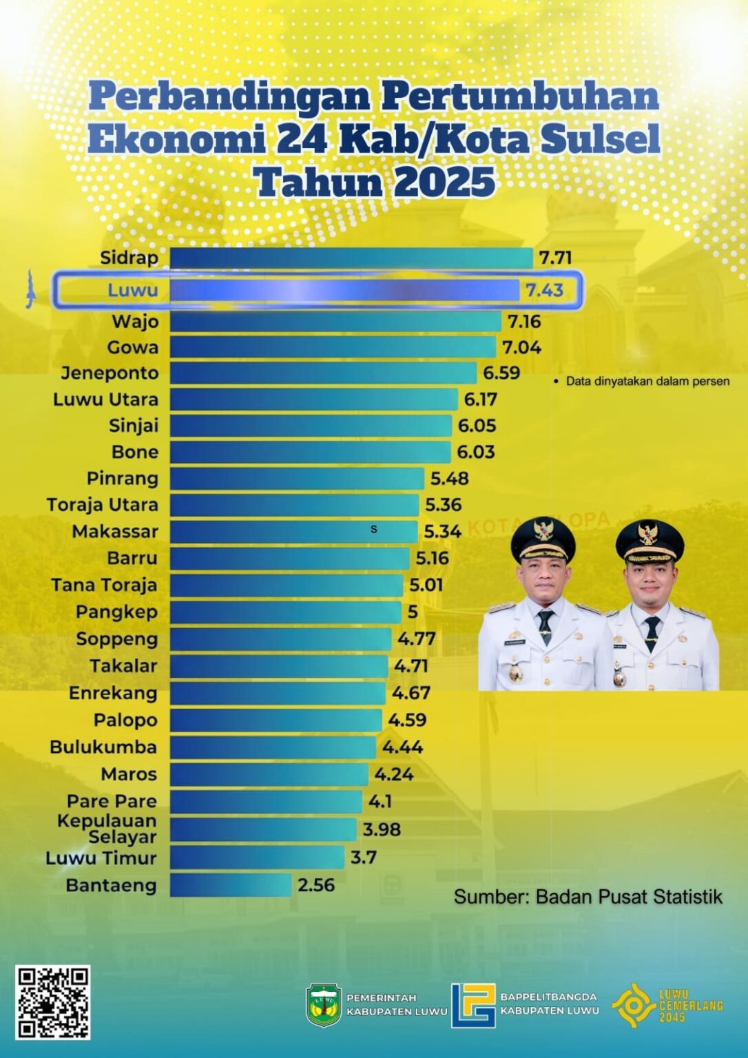 LUWU – Laju pertumbuhan ekonomi Kabupaten Luwu pada 2025 mencapai 7,43 persen. Capaian ini menempatkan Luwu di posisi kedua tertinggi dari 24 kabupaten/kota di Sulawesi Selatan.