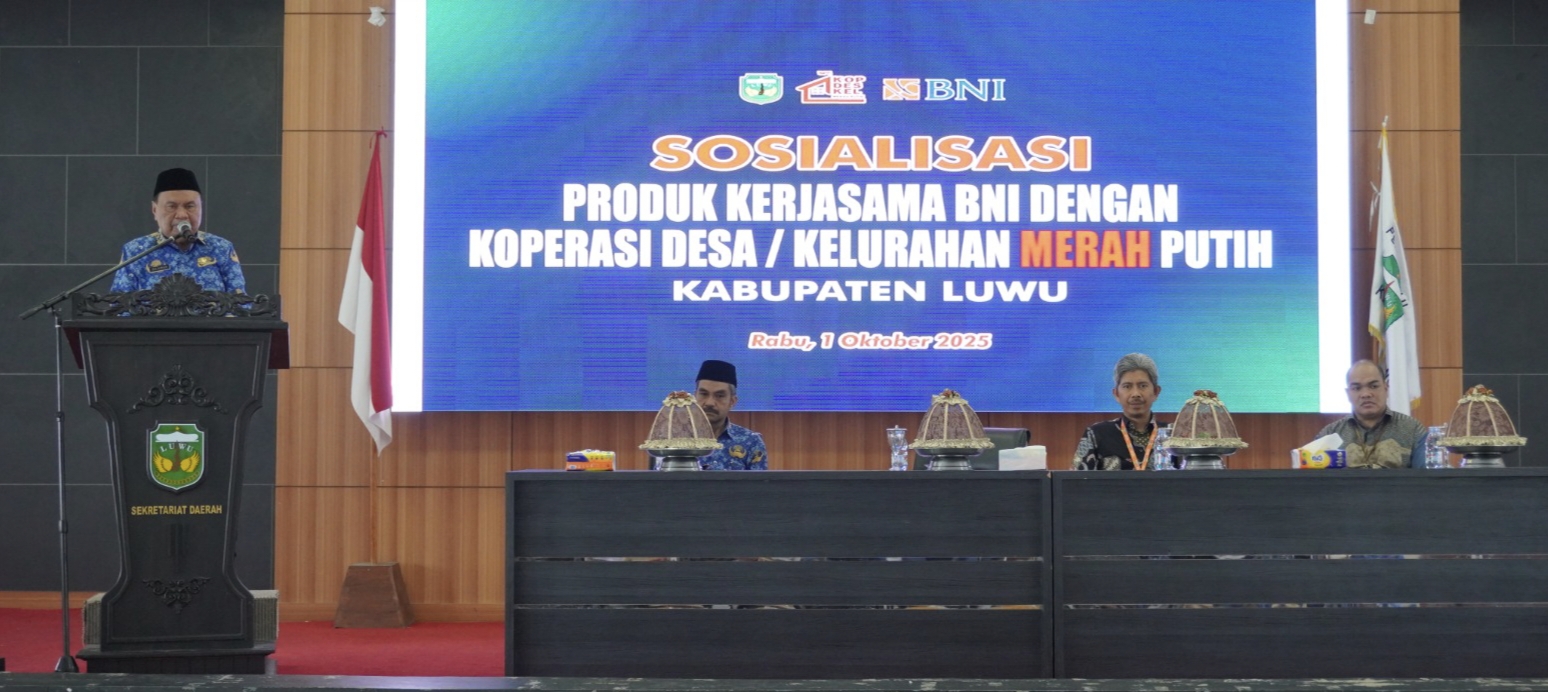 LUWU – Pemerintah Kabupaten Luwu dalam hal ini Dinas Koperasi, UMKM dan Perindustrian bekerjasama dengan PT. Bank Negara Indonesia (BNI) menggelar Sosialisasi Produk Kerjasama BNI Dengan Koperasi Desa/Kelurahan Merah Putih di aula Andi Kambo Kompleks Perkantoran Bupati Luwu, Rabu (01/10/2025).