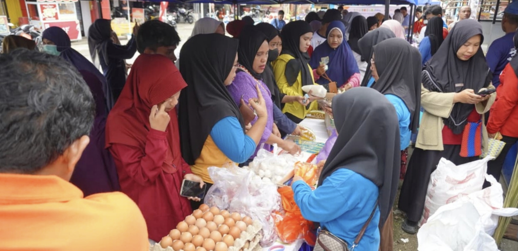 Sejumlah komoditas dijual dengan harga subsidi, di antaranya telur Rp55.000 dan Rp50.000 per rak, gula pasir Rp17.000 per kilogram, serta minyak goreng kemasan bantal Rp15.500 per liter.